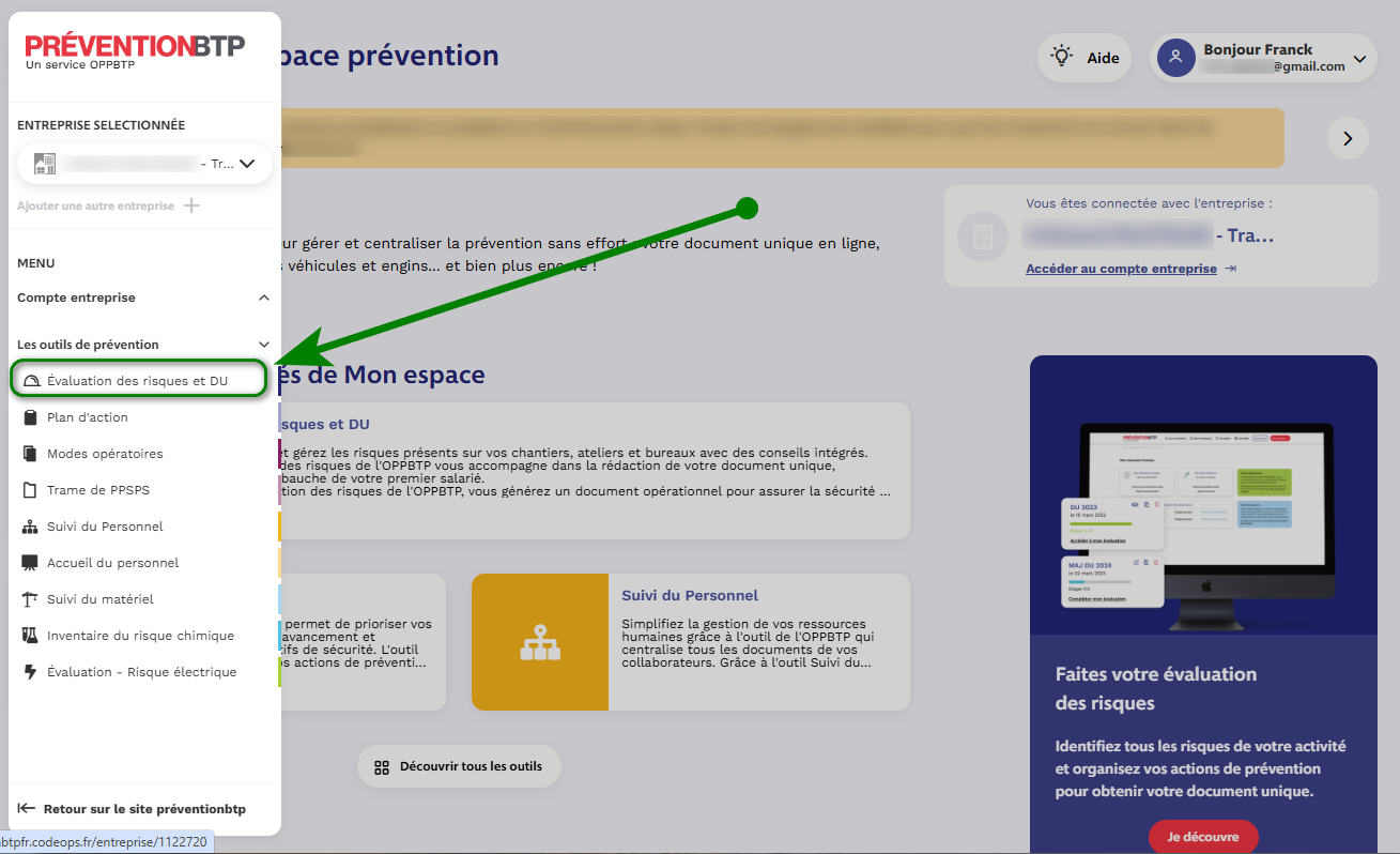 Connectez-vous à votre espace à partir du site www.preventionbtp.fr et créez votre dossier d'évaluation ou reprenez l'existant.