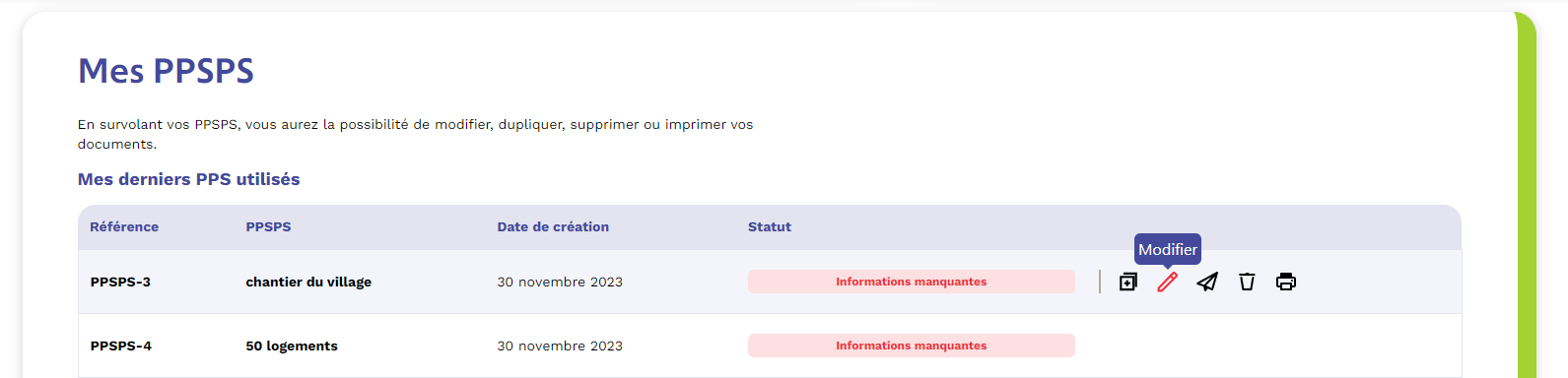 Pour modifier ou mettre à jour un PPSPS déjà créé dans l'outil, consulter votre inventaire et survolez la ligne du PPSPS à modifier pour voir apparaître les options.