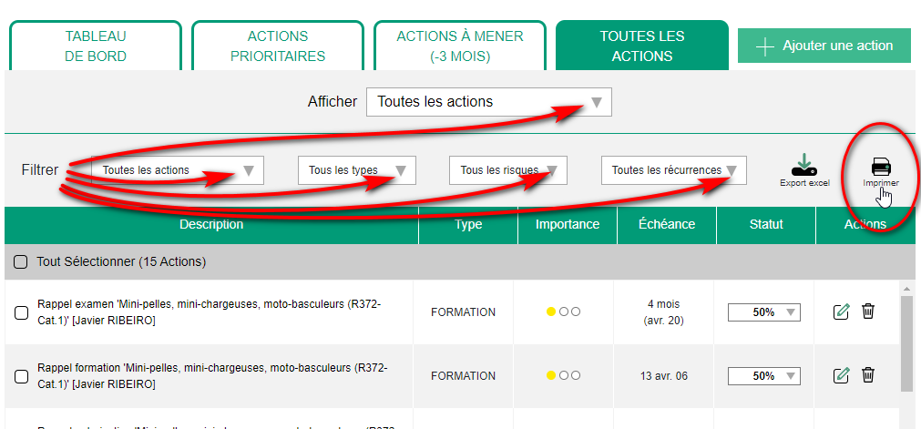 Après avoir appliqué les filtres souhaités dans l'outil "mon plan d'action", il est possible de générer un PDF ou un excel imprimable :