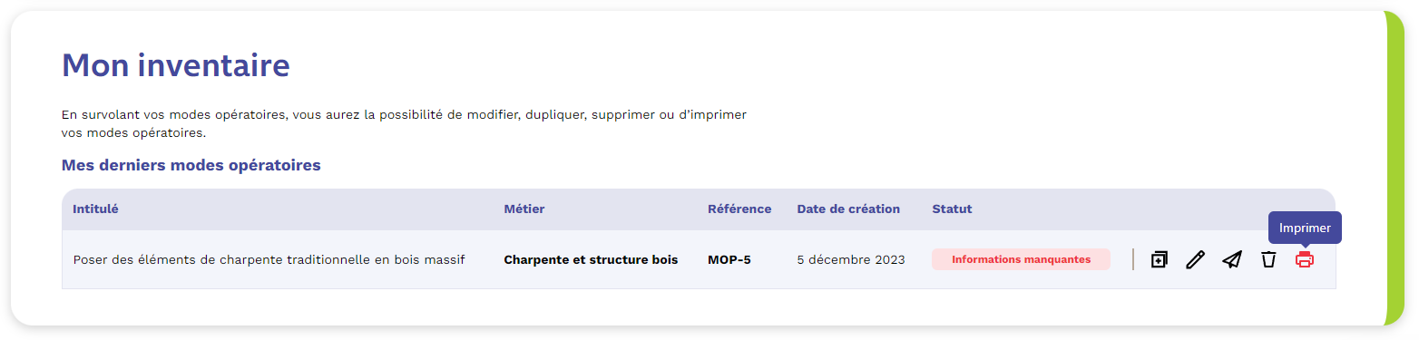Pour imprimer votre mode opératoire, consulter votre inventaire et survolez la ligne du mode opératoire à imprimer pour voir apparaître les options.