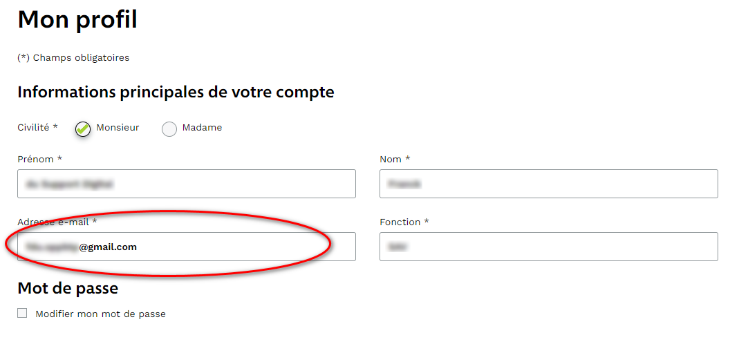 Si vous vous souvenez de votre mot de passe, vous pouvez toujours accéder à votre profil en utilisant l'ancienne adresse comme identifiant. Vous pouvez ensuite la remplacer par la nouvelle dans "profil personnel" :