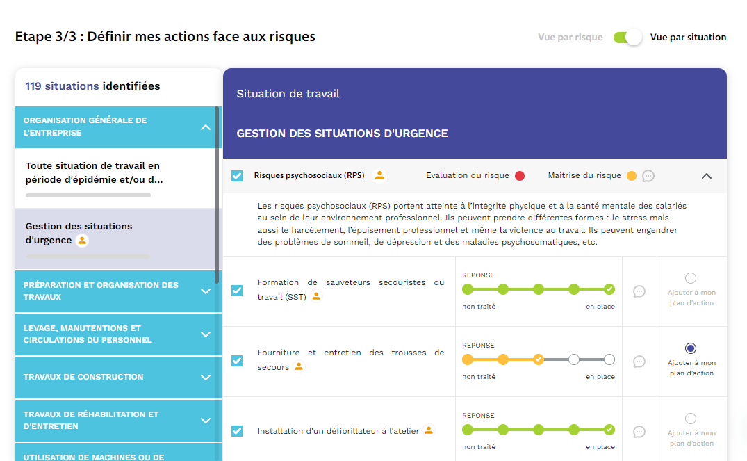 Tout comme pour la formation des SST, les actions liées à la fourniture de trousse(s) de secours ou d'un défibrillateur n'existent pas encore en tant que telles dans notre outil. Ces actions intéressantes consistent à rassurer les collaborateurs sur la possibilité d'intervenir en cas de besoin.