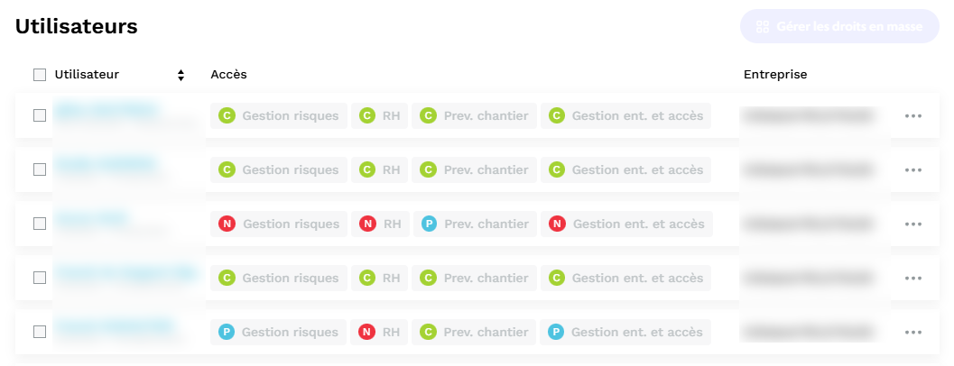 Chaque utilisateur a un statut d'accès par famille d'outils, 4 familles : Gestion risques, RH, Prev chantier et Gestion ent. et accès