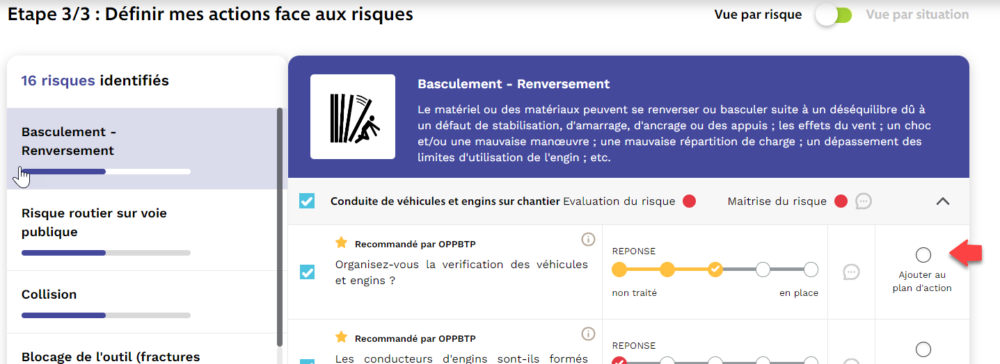 En étape 3 de l'évaluation des risques, pour qu'une action (ou mesure de prévention) apparaisse au plan d'action, la case "ajouter à mon plan d'action" doit être cochée :
