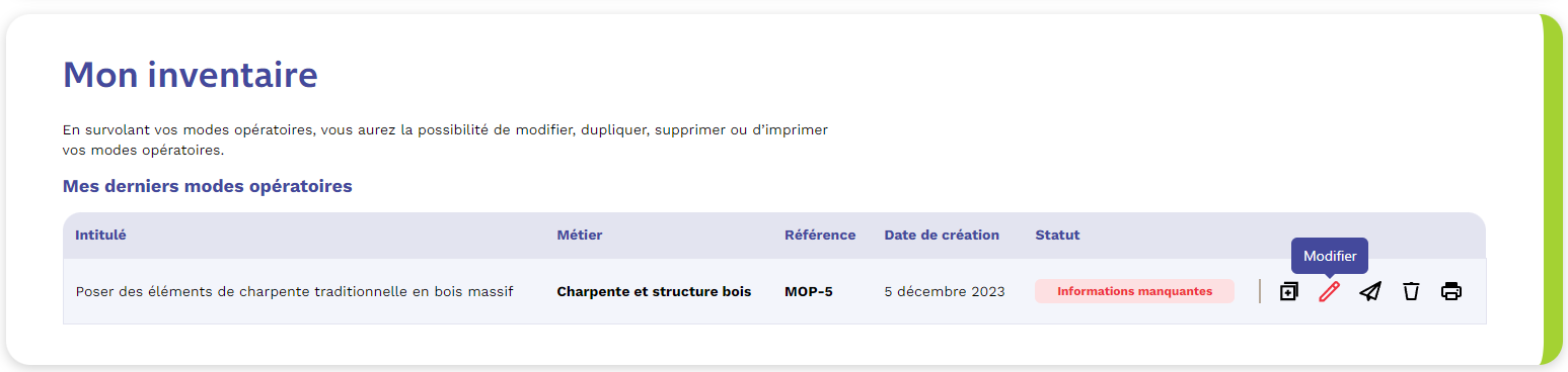 Pour modifier ou mettre à jour un mode opératoire déjà créé dans l'outil, consulter votre inventaire et survolez la ligne du mode opératoire à modifier pour voir apparaître les options.