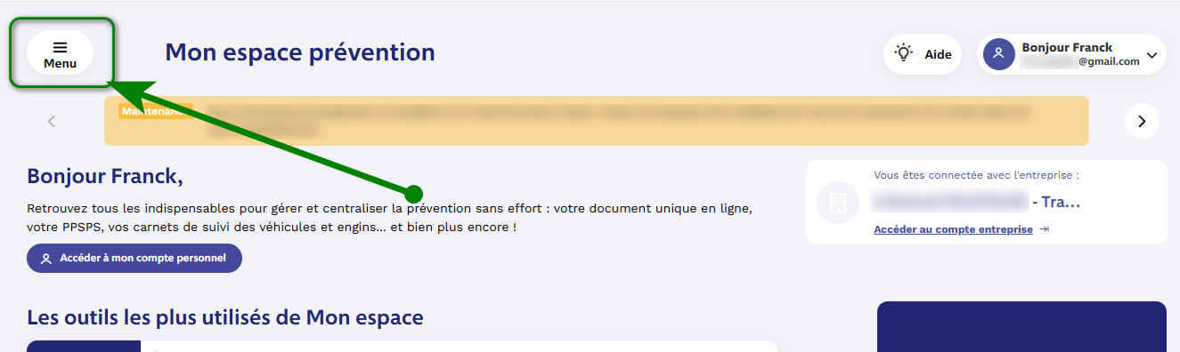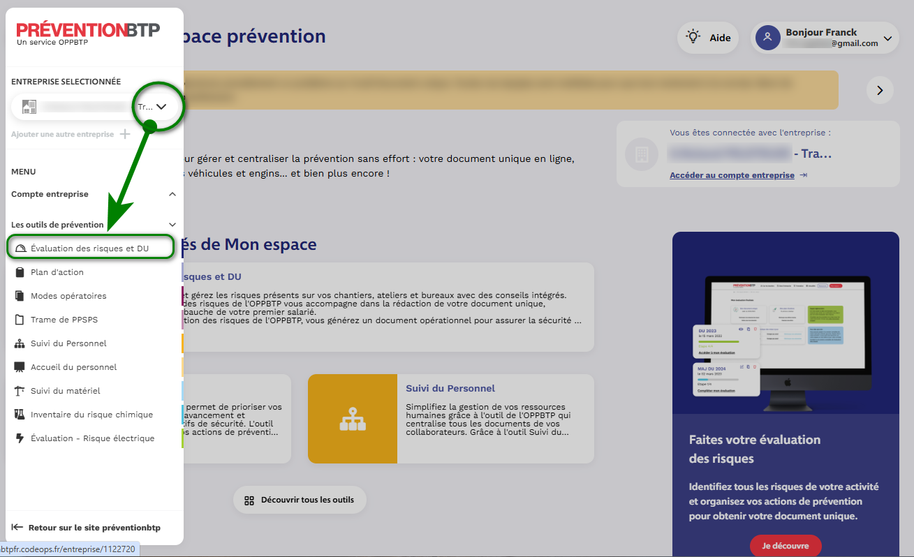 Sélectionner l'entreprise si nécessaire dans le menu déroulant, puis accédez à l'outil d'évaluation des risques dans le menu des outils :